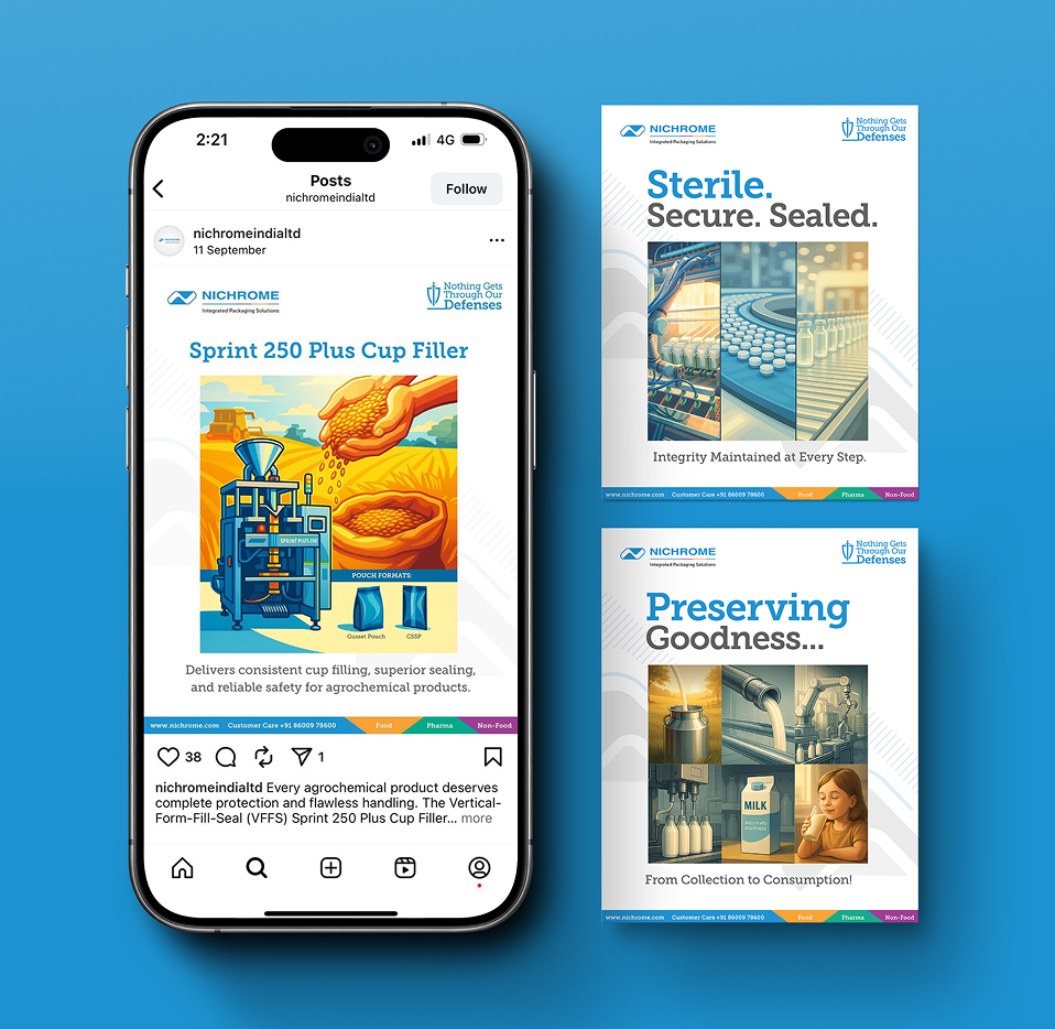 Recognizing Nichrome’s focus on core industries: pharmaceuticals, food, and non-food, we developed a targeted strategic framework to articulate how Nichrome delivers uncompromising quality and reliability across diverse sectors. Our approach emphasises capturing every detail and phase of Nichrome’s engineering and packaging processes, empowering customers with confidence that an unwavering commitment to excellence protects their products. This led to the creation of the bold campaign strategy, “Nothing Gets Through Our Defenses,” a powerful affirmation of the brand’s role not merely as a provider of packaging systems, but as a trusted guardian of quality.